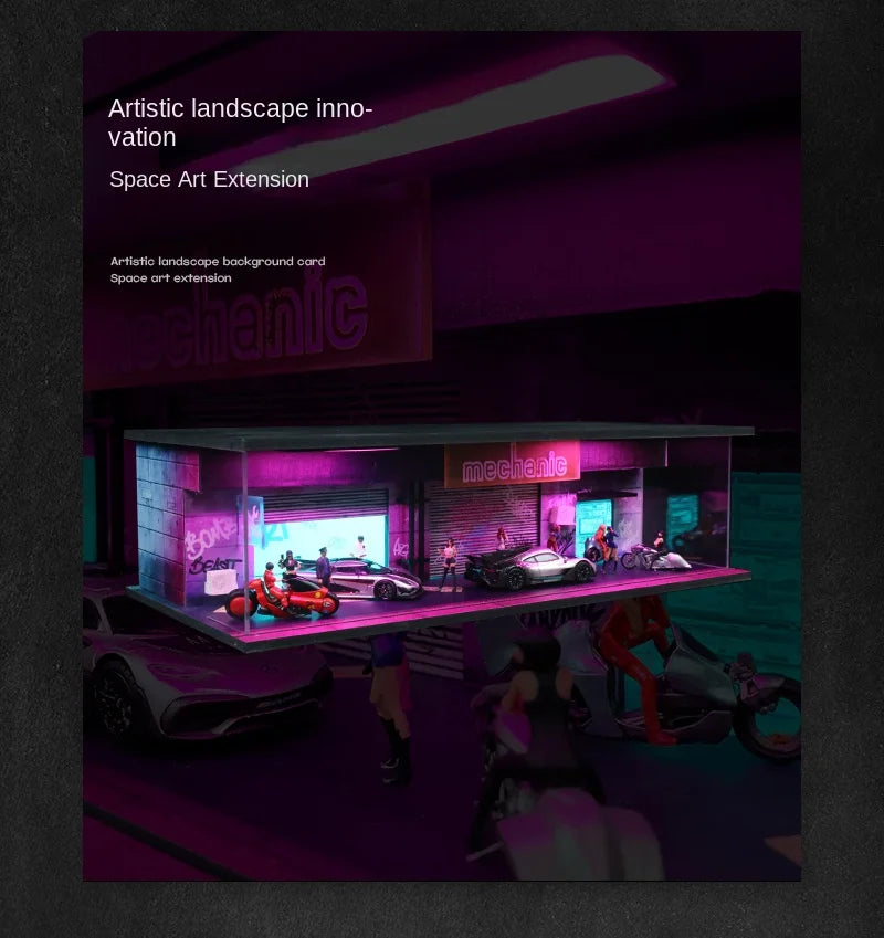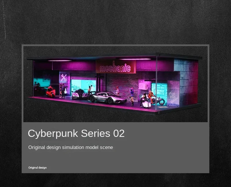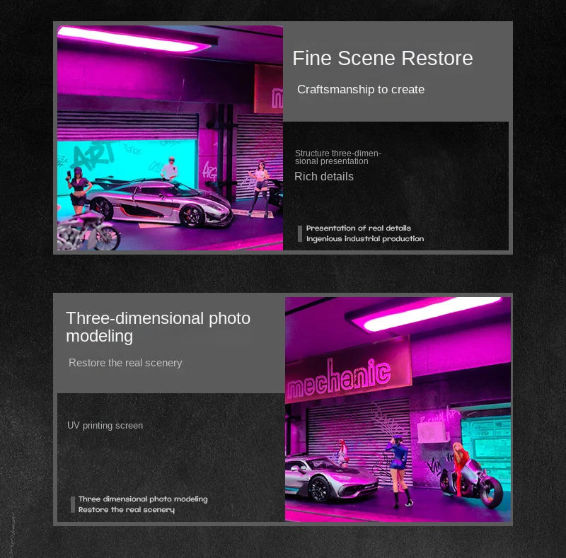 Cada parte está cuidadosamente pensada para recrear un auténtico garaje urbano, elevando la estética de tu vitrina o espacio de exhibición.