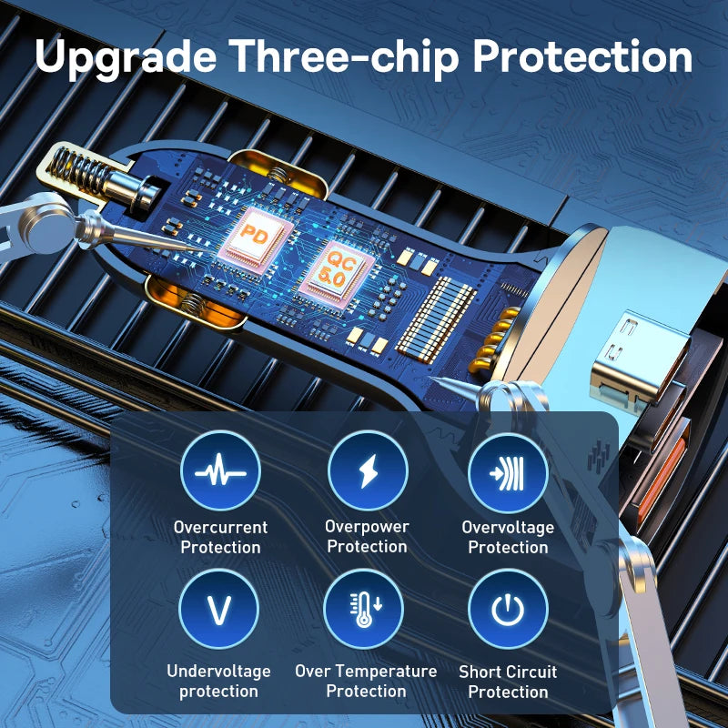 Tres tipos de chips de reconocimiento inteligente están integrados para evitar que los dispositivos tengan sobrecorriente, sobretensión, sobretemperatura, cortocircuito y sobrecarga de energía.